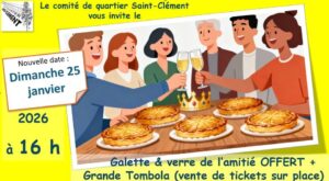 Le comité de quartier Saint-Clément est heureux de vous inviter à partager une galette et le verre de l’amitié le dimanche 25 janvier à l’annexe du Castelet de la Maison pour Tous François Villon (au 211, avenue Marius Carrieu, entrée de la salle par le parking du bas de la résidence) à partir de 16 heures.